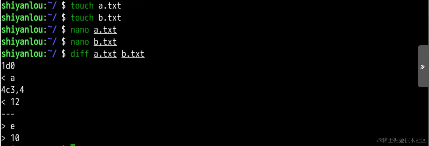 - 类似 comm 命令,diff 命令被用来监测文件之间的差异。然而,diff 是一款更加复杂的工具,它支持许多输出格式,并且一次能处理许多文本文件。