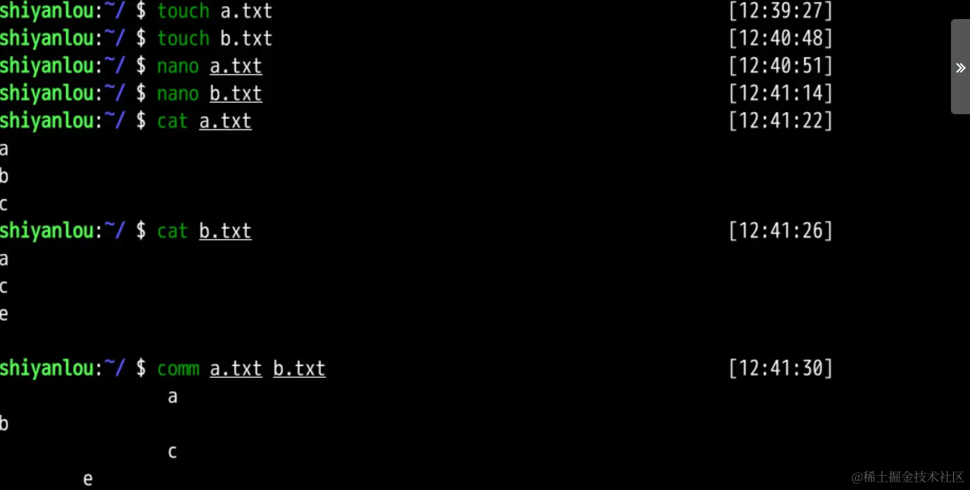 - comm 命令将逐行比较已经排序的两个文件。显示结果包括 3 列:第 1 列为只在第一个文件中找到的行,第 2 列为只在第二个文件中找到的行,第 3 列为两个文件的共有行。