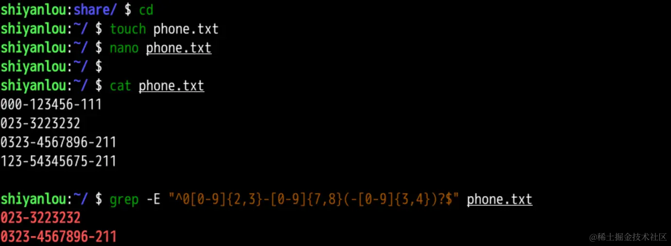 - 验证固定电话,打印符合条件的电话,固定电话格式基本都是带有 0 的区号+连接符“-”+电话号码,另外还有可能有分机号,区号有 3 位、4 位,电话号码有 7 位和 8 位的