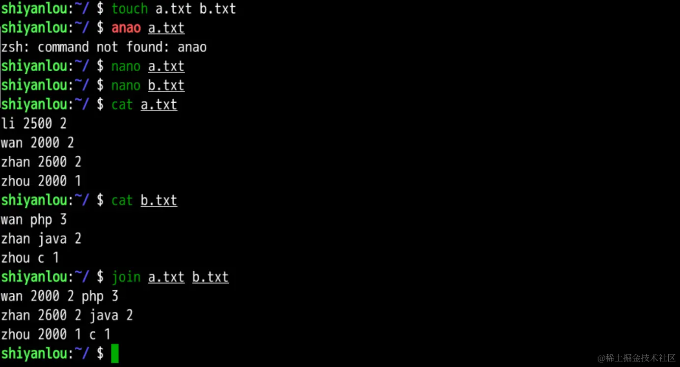 - join 命令类似于 paste,它会往文件中添加列,但是它使用了独特的方法来完成。一个 join 操作通常与关系型数据库有关联,在关系型数据库中来自多个享有共同关键域的表格的数据结合起来,得到一个期望的结果。这个 join 命令执行相同的操作,它把来自于多个基于共享关键域的文件的数据结合起来。