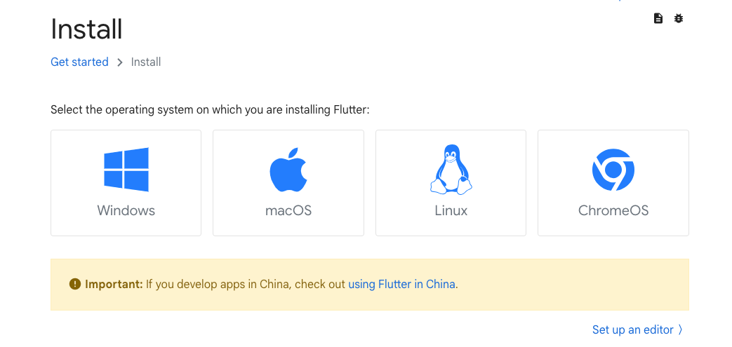 - 打开浏览器,进入官网安装手册Install | Flutter页面;