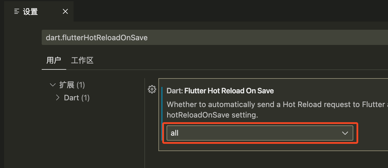 打开vscode配置文件,搜索dart.flutterHotReloadOnSave,选择all。
