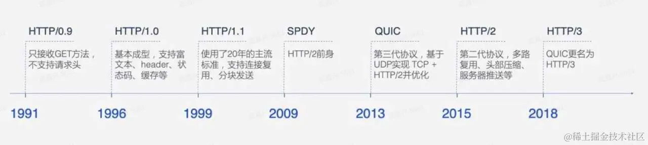 其中HTTP2.0是基于Google的SPDY协议创建的,更注重性能改善,但还未普及。 HTTP3.0是基于Google的QUIC协议,也是将来的发展方向。