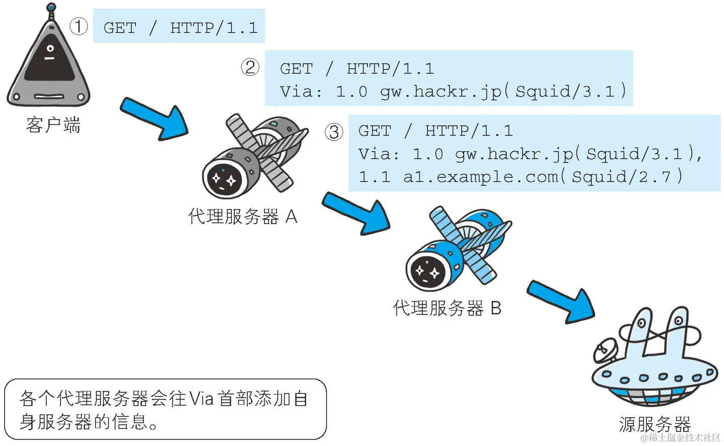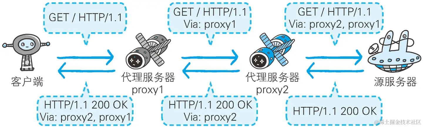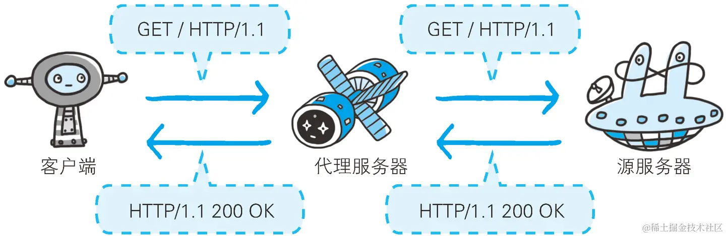 - 代理:HTTP传输过程中的“中转站”,可以实现缓存加速、负载均衡等功能