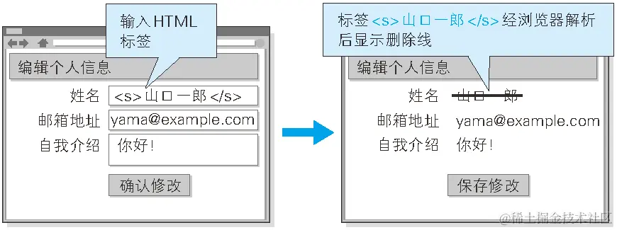 如输入表单中插入恶意的script标签