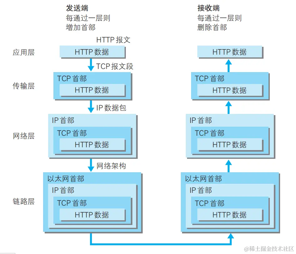 发送数据:通过协议栈逐层向下,每一层都添加本层的专有数据,层层打包,然后通过下层发送出去。