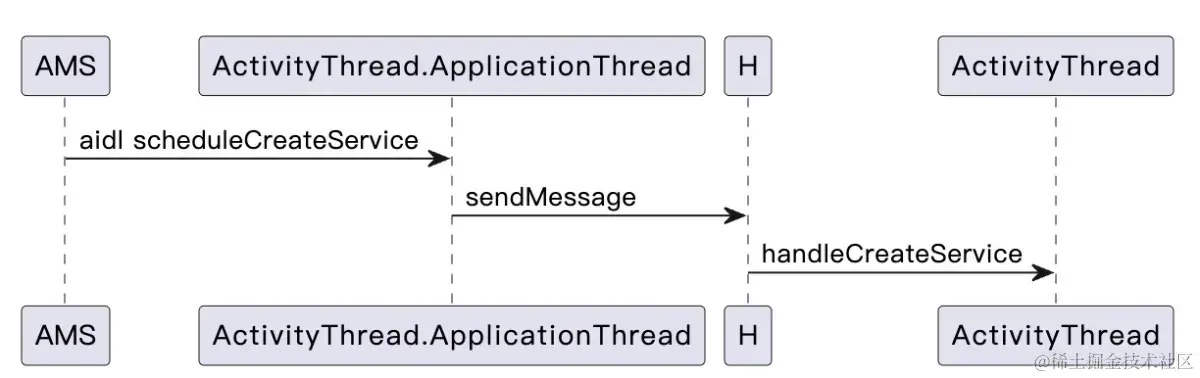 以Service为例子,当AMS需要启动应用的Service的时候都会通过aidl调用到应用进程的ActivityThread.ApplicationThread.scheduleCreateService,然后应用在里面通过handler同步到主线程去调用handleCreateService: