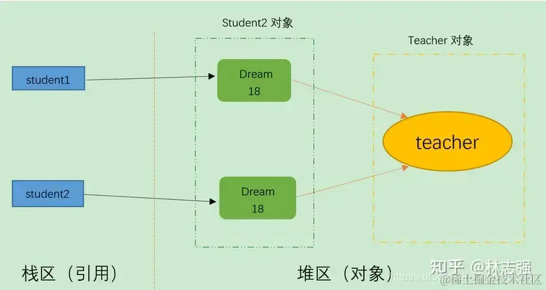 两个引用student1和student2指向不同的两个对象,两个引用student1和student2中的两个teacher引用 指向的是两个对象,但对teacher对象的修改只能影响student1对象,所以说是深拷贝。