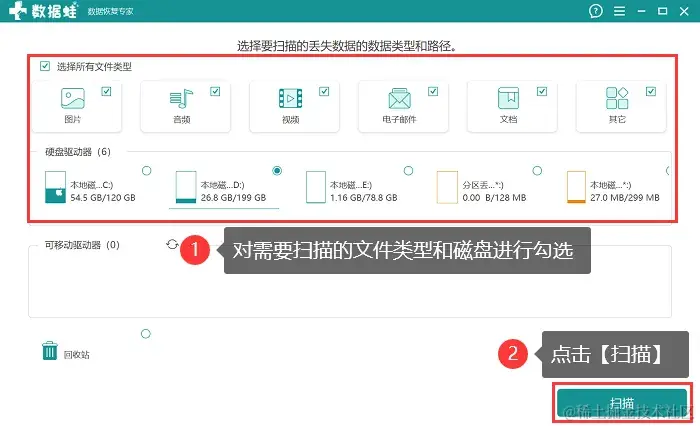 第2步:对需要恢复的文件类型进行勾选,并对需要扫描的磁盘进行勾选,完毕后,单击【扫描】;