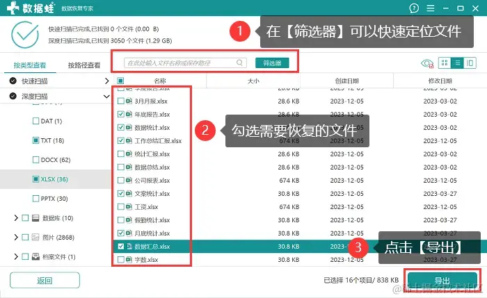 第4步:等待深度扫描结束后,文件呈现会比较多,建议直接在【筛选器】中对文件进行定位,完成文件选择后,点击 【导出】 ,并选择正确的导出位置即可。
