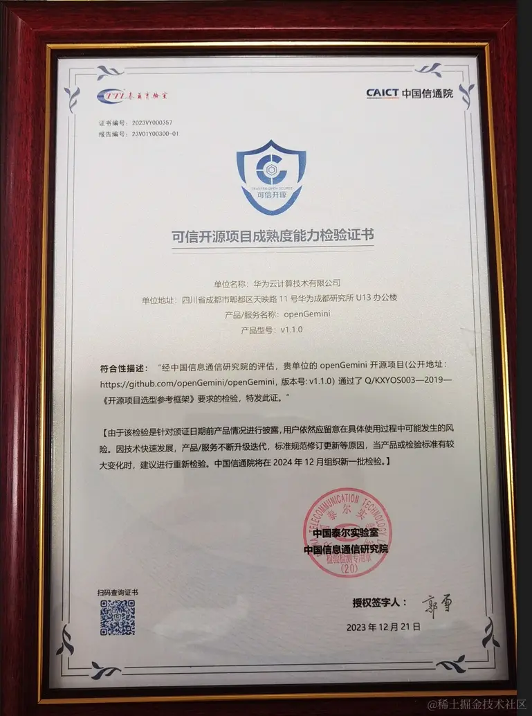 “可信开源项目” 是由中国信通院推动的开源项目评估,对开源项目的健康程度与可持续性展开评测,以降低开源项目的安全风险,完善开源项目的开发者、用户生态。重点考察开源项目在许可证合规性、软件安全性、软件活跃度、技术成熟度、服务支持力和软件兼容性六个方面的能力,全面衡量社区版开源项目的健康程度,为开源项目使用方提供选型的参考依据。openGemini通过该项认证,充分证明了社区的健康程度和可持续性发展。
