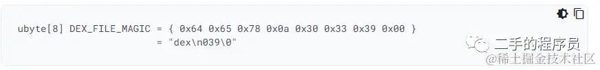 为啥要搜索这几个字节呢?是因为这几个字节是 dex 的文件魔数。可以看下官方文档介绍: