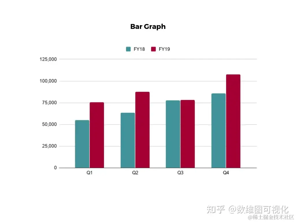 条形图是另一种常用且易于使用的数据可视化图表。在这种类型的可视化中,图表的一个轴显示要比较的类别,另一个轴显示测量值。条形图的长度表示每个组如何根据该值进行测量。
