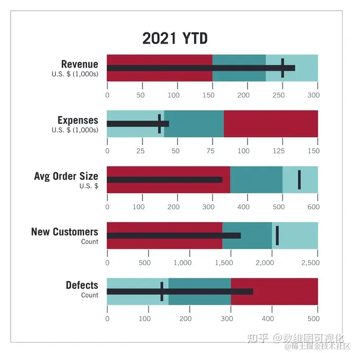 项目符号图是一种旨在根据目标值和范围进行基准测试的图表。这是一个非常节省空间的图表,主要用于显示性能数据。从视觉上看,项目符号图类似于条形图/柱形图和进度条的组合。结果显示在单个条形或列中。范围栏是根据比较所基于的类别中的值(例如竞争对手的销售数据)构建的。然后将所有这些值划分为一定数量的子范围(在大多数情况下是四分位数)。目标显示目标值。条形图显示实际数字。