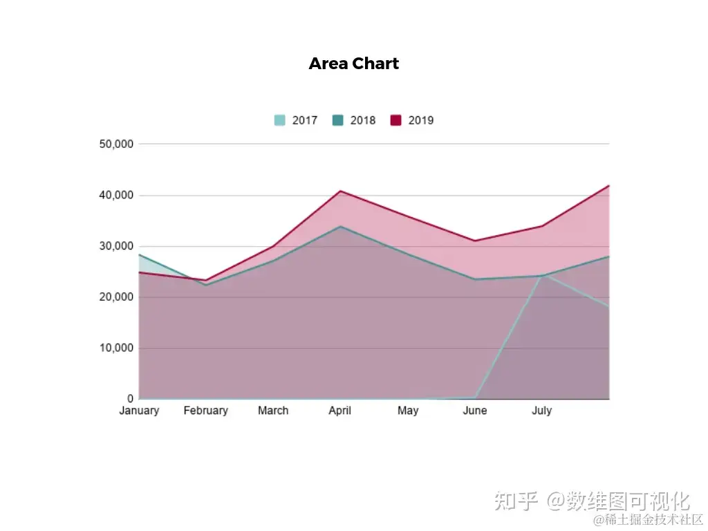 面积图是基本折线图的变体,其中折线图下方的区域被阴影化以表示每个数据点的总值。当必须在同一图形上比较多个数据系列时,将使用堆积面积图。