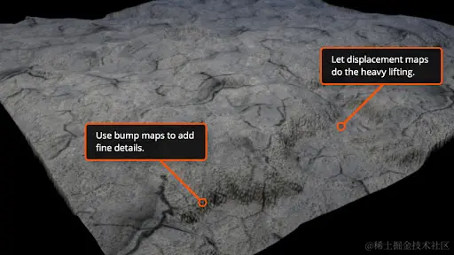许多艺术家更喜欢使用这些贴图,因为它们不仅有助于创建凸起表面的错觉,而且还会影响几何图形,从而产生高细节的渲染。此外,置换贴图在创建游戏资产时没有用处,因为使用这些贴图生成的细节仅在渲染输出中可见,而在游戏引擎本身中不可见。