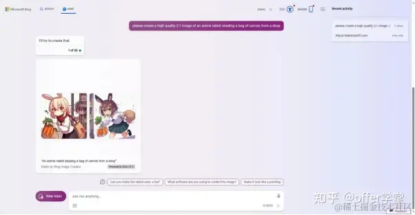 当然,Bing Chat工具还有其他的优势。例如:您可以免费使用OpenAI DALL-E 3的文生图工具,即通过文本输入,来创建高度精细的原始图像。