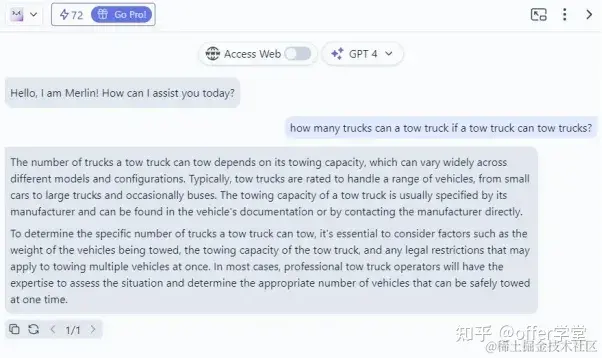 作为一款便捷的Chrome浏览器扩展,Merlin同样可以每日有限次数地对GPT-4免费提供查询和访问。Merlin的优势主要体现在请求上。作为Merlin的免费用户,您每天能够收到102个请求的额度。其中,每个GPT-4问题将消耗您30个请求。与大多数免费的GPT-4工具类似,您每天可以获得约3个免费的GPT-4提问机会。此外,Merlin还提供了访问网络请求的选项,不过这会让请求的数量翻倍,即:60个请求而不是30个。