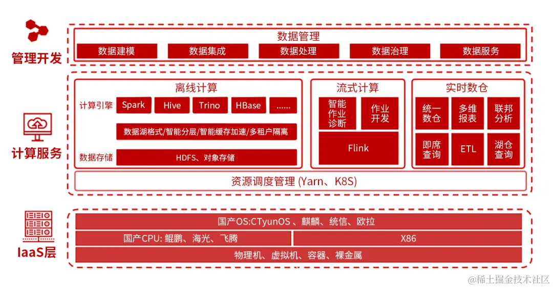 天翼云大数据平台是基于云原生技术打造的,集资源、服务、任务、应用等多层级运维管理于一身的服务平台。在技术路线上,天翼云大数据平台实现了硬件、操作系统、存储、计算、调度、中台层全栈自主可控,打造了软硬协同的存储计算引擎,拥有国产化生态下业界领先的极-致性能。