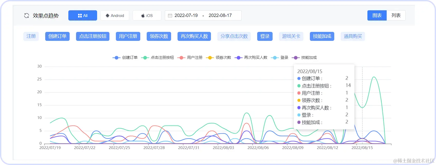 各推广渠道获取用户的全链路数据,包括访问、点击、安装,以及可自定义的后续用户行为效果点数据,可以精准体现每个渠道带来的用户注册、付费、参与情况。