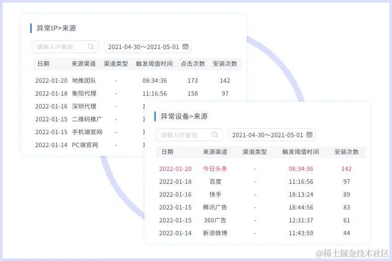 有流量的地方就会伴随着作弊行为的出现,多维度数据源也给作弊监控提供了绝佳数据基础,openinstall结合用户行为特征模型和多策略交叉防护机制实现了作弊监控功能。通过开启“点击IP、安装IP、安装设备、点击劫持窗口期”等阈值,可以实时监控被标记出来的恶意流量等异常行为。