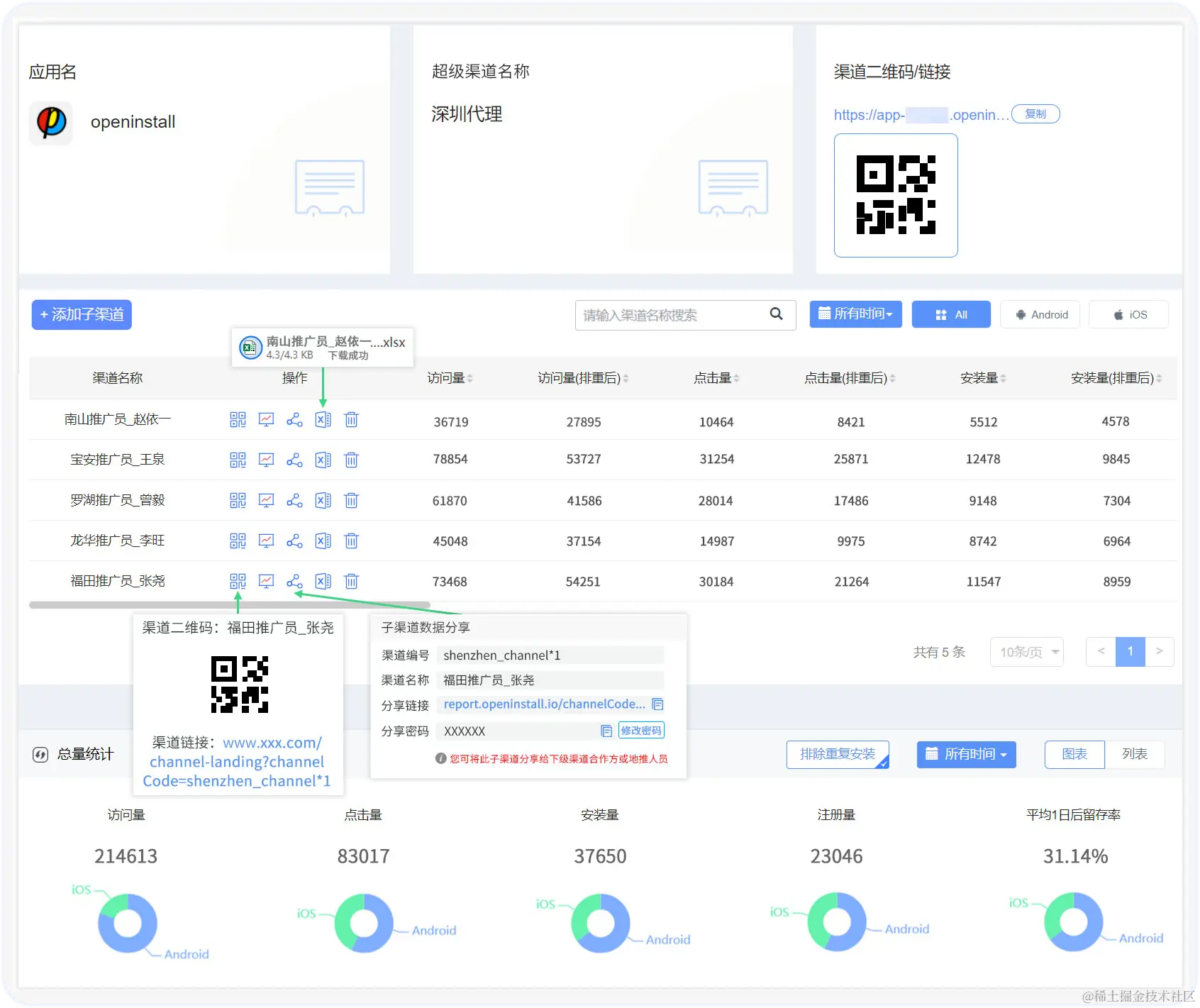 此时,一个精准的统计工具和详尽的可视化报表就显得尤为重要。openinstall渠道统计功能和渠道管理后台,能帮助App快速生成携带统计能力的专属链接,无需人工统计和填码,自动追踪统计并生成实时归因的数据报表,实现降本提效和精细化运营。