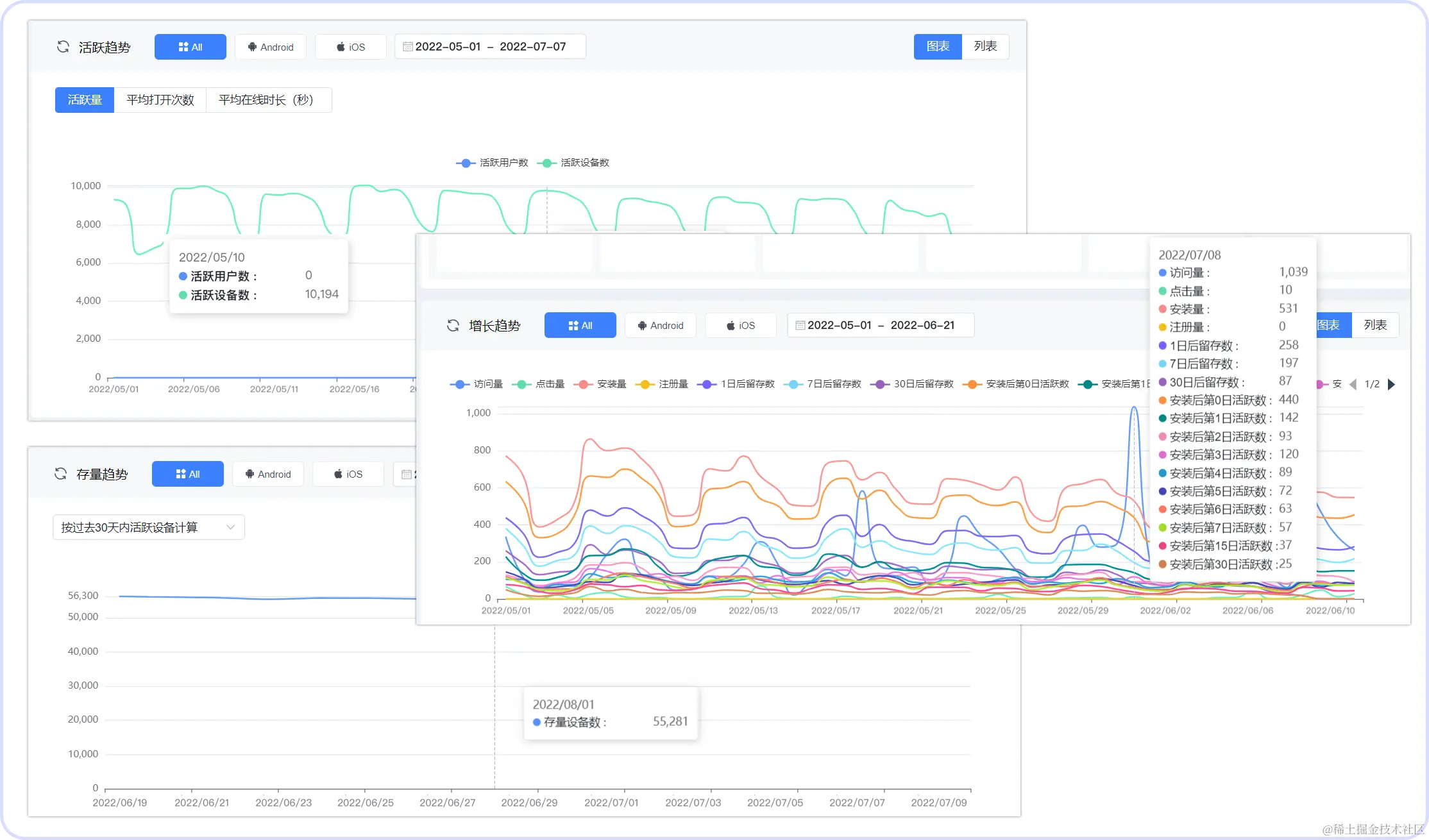 根据这些数据,推广运营部门可以得知App整体的成长轨迹,以此来统筹App在每个生命周期的数据趋势,分析各项用户特征和设备属性,做好针对性的长期服务和运营规划。