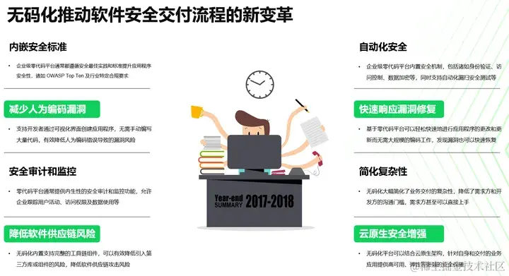 其中,我们采用无代码的方式提升软件安全的交付流程,具有典型的优势。例如,无代码平台内嵌了安全标准,用户无需自行搭建。核心在底层,我们在云原生底层平台可以再做一层,进一步确保安全性。