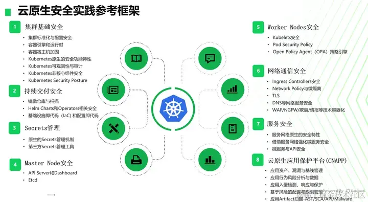 这里有一个安全实践的参考框架,涵盖了集群安全、软件开发交付安全、软件配置安全管理、运行节点安全、网络通信安全以及运行服务之间的安全等多个方面,从整体来考虑安全。