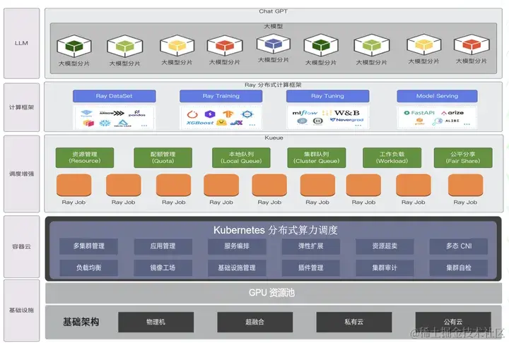 最终,我们整理出了一张全面的技术架构图,为企业内部实施大模型场景提供了参考。这张图涵盖了从底层云平台到上层大模型框架的所有支撑技术。