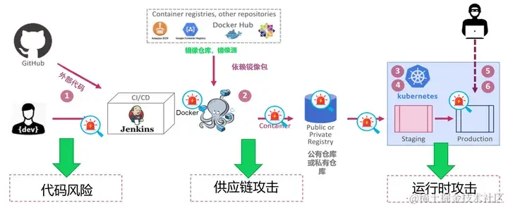 作为一个 DevOps 团队,它的上线流程通常如下图所示从一开始开发团队提交代码到代码仓库,到最后部署交付到生产集群。各个环节都应有部署对应的安全监测能力,检查潜在的安全风险。下图中每个标记的位置上,都存在风险爆发的可能性。
