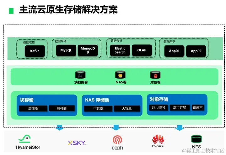这种存储方案是将各种底层存储技术,如分布式存储、块存储和文件存储等,有效地提供给上层业务系统使用。为此,我们做了一个统一接入的存储平台,预先对接了业内常见的各种存储系统,以实现无缝集成。对于应用来说,只需在应用代码中添加一条存储配置,就可以便捷地使用底层的各种存储。