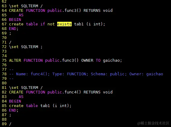 在KES中,用sys_dump来导出mysql模式的数据库,在导出时也不会包含和对象相关的DDL语句中的EXISTS选项。但是如果是PLSQL层面,如果用户在定义的函数中(不是定义函数时)使用了EXISTS选项,则导出的sql文件中会包含该EXISTS选项。
