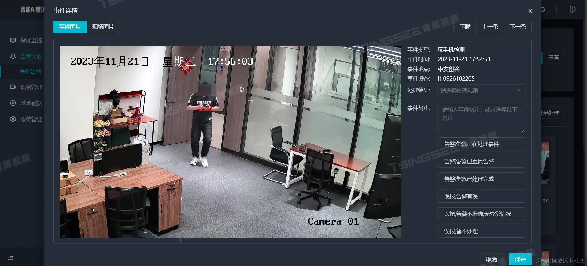 以TSINGSEE青犀智能安防视频监控系统为例,基于内置的AI算法模型,可以实现对监控场景的智能检测与安全隐患分析和预警,系统可实现的AI识别能力包括:人脸识别、人脸检测、区域入侵检测、车辆违停检测、区域人员统计、人员聚集、抽烟/玩手机/打电话检测、安全帽/反光衣/工服检测、烟火检测等,能应用在工厂、工地、社区、园区、楼宇、校园、消防等场景与行业中。