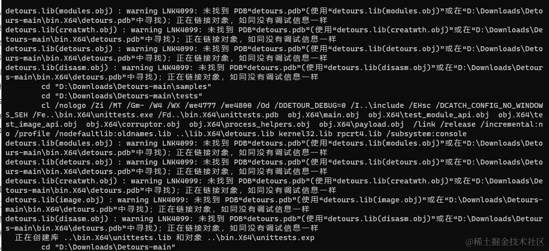 那么只需要在编译之前执行下set DETOURS_CONFIG=Debug就可以编译成Debug版本的了,会生成一个lib.X64Debug目录,里面编译出来的lib就有了pdb文件