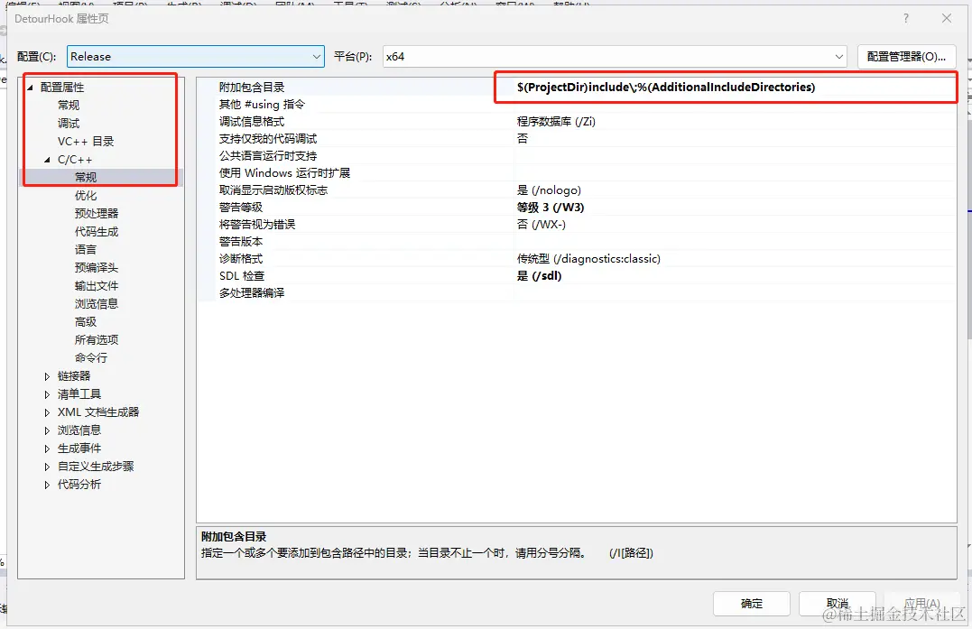 如果就想Detours就两个头文件,你可以直接添加到项目里,如果头文件比较多的话,放到dllmain.cpp目录下,然后在右键属性里,配置属性->C/C++->常规->附加包含目录添加这个头文件目录,我这里用$(ProjectDir)来表示项目的目录, 你也可以添加绝对路径。