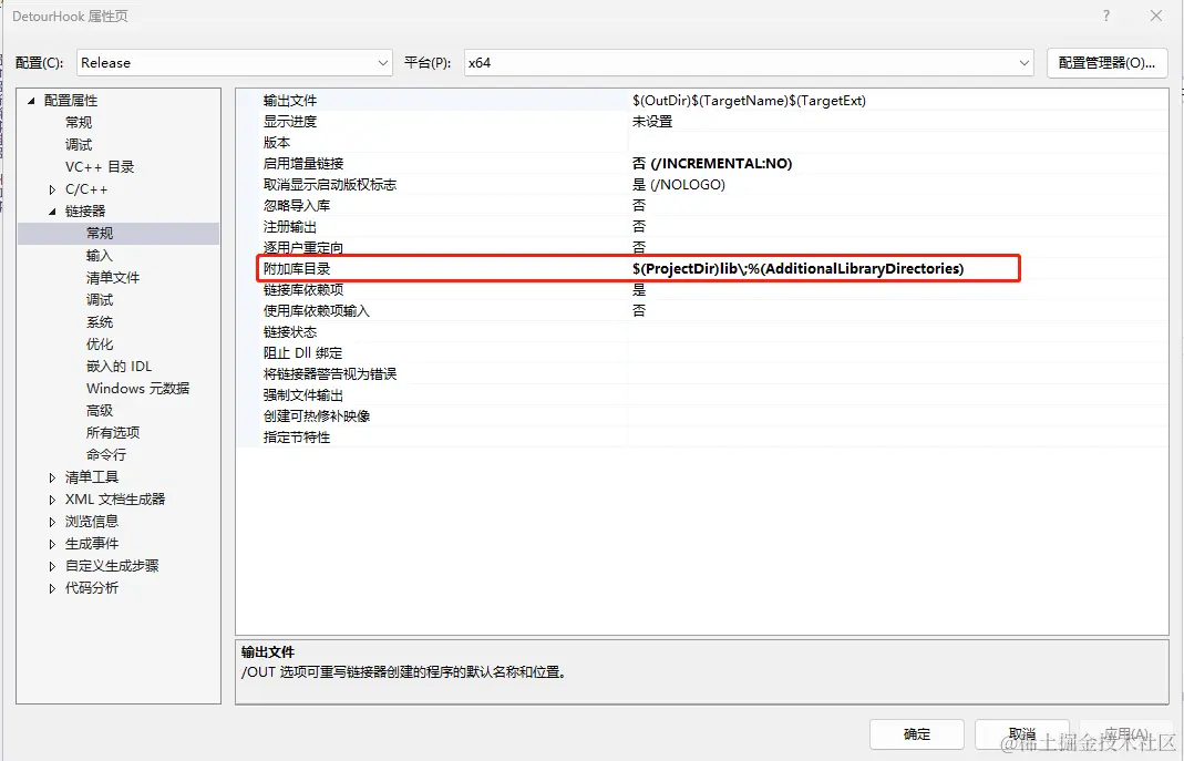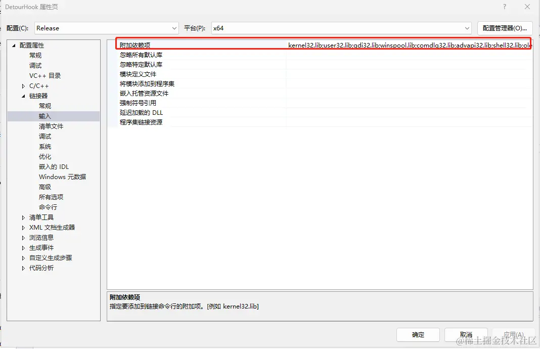 不过我更喜欢在代码里用#pragma comment(lib, "detours.lib")来引入lib库,因为这样可以根据宏来分别引入Debug还是Release的lib