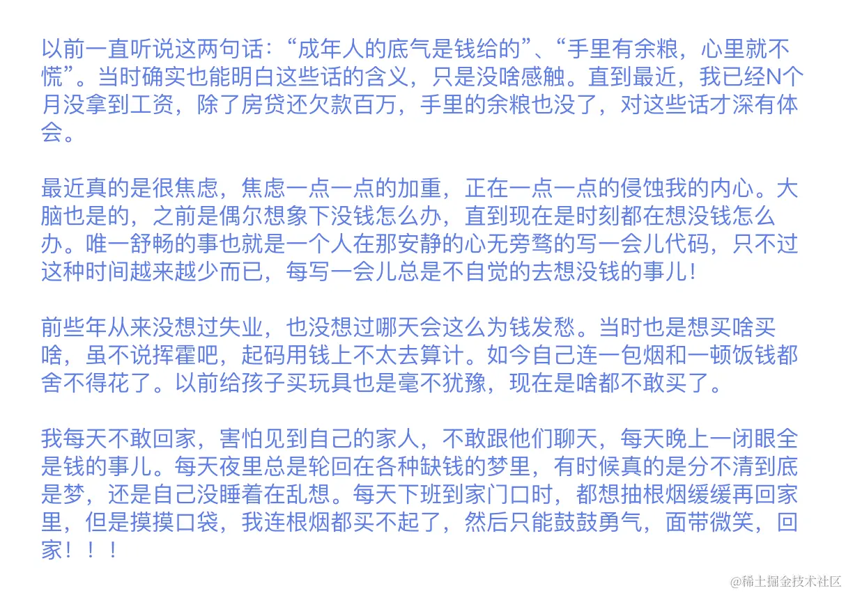 最近,一个朋友跟我聊,下面是他没钱后的一些感受,挺真实的。希望这种感受不要出现在我们平凡的IT打工人身上。他是这么说的: