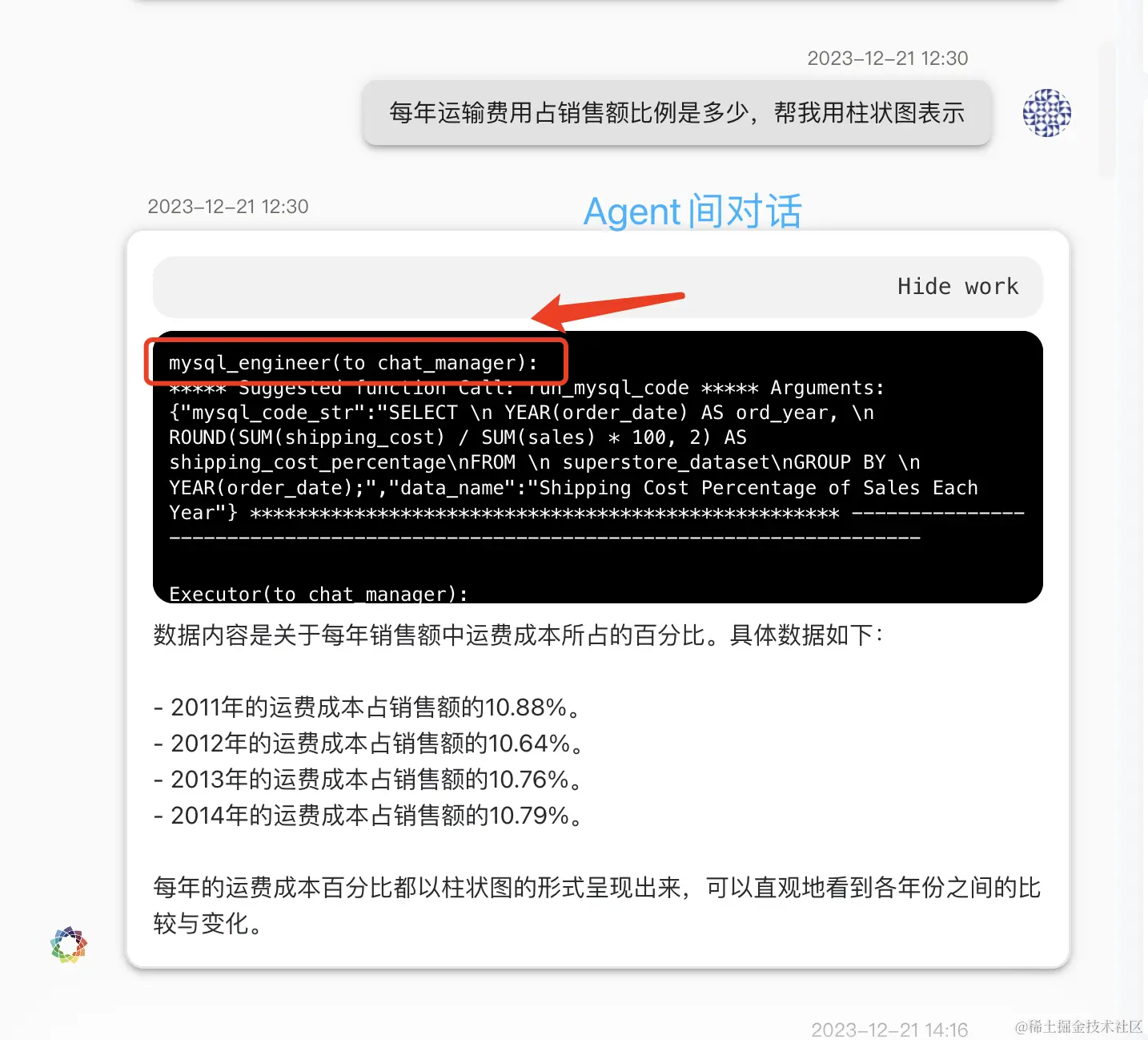 我们还是先以刚才一句话生成可视化图表的demo为例,这次,我们来具体看看muti-Agent(AI智能体们)之间到底是怎么展开工作的