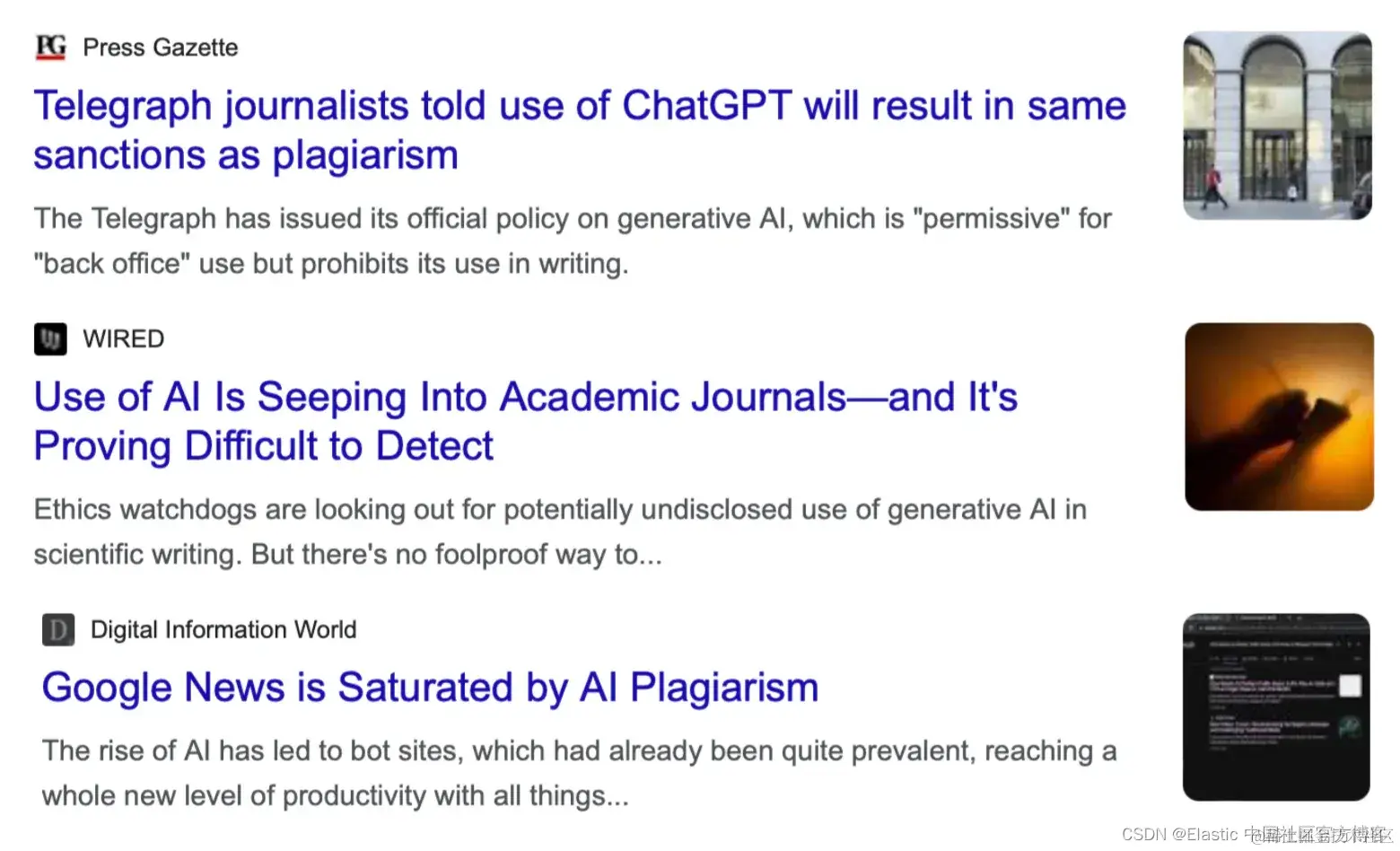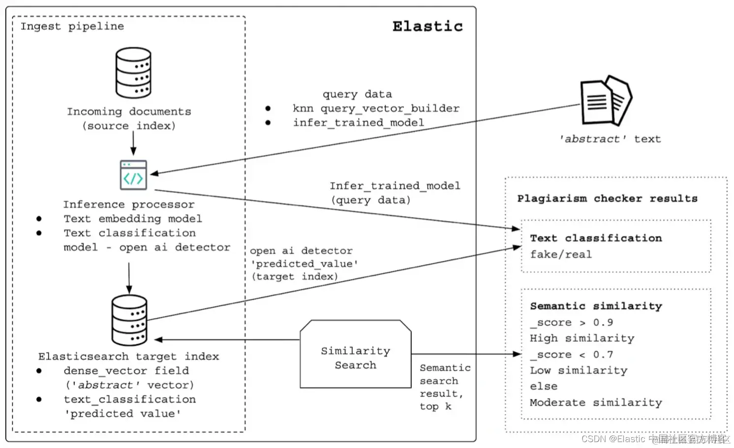 这通过 Python 示例进行了演示,其中我们利用包含 NLP 相关文章的 SentenceTransformers 的数据集。 我们通过执行 “语义文本相似性” 来检查摘要是否抄袭,考虑到使用之前导入 Elasticsearch 的文本嵌入模型生成的 “abstract” 嵌入。 此外,为了识别人工智能生成的内容 —— 人工智能抄袭,OpenAI 开发的 NLP 模型也被导入到 Elasticsearch 中。