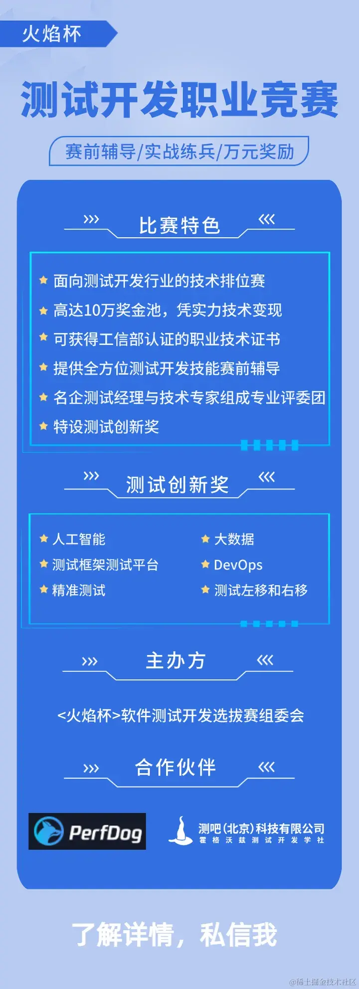 此次竞赛由<火焰杯>测试开发职业竞赛组委会主办,PerfDog与测吧(北京)科技有限公司协办,与往年相比,今年的竞赛进行了全面升级,特别设立了测试创新奖,涵盖人工智能、大数据、测试框架测试平台、DevOps、精准测试、测试左移右移等新方向创新项目。