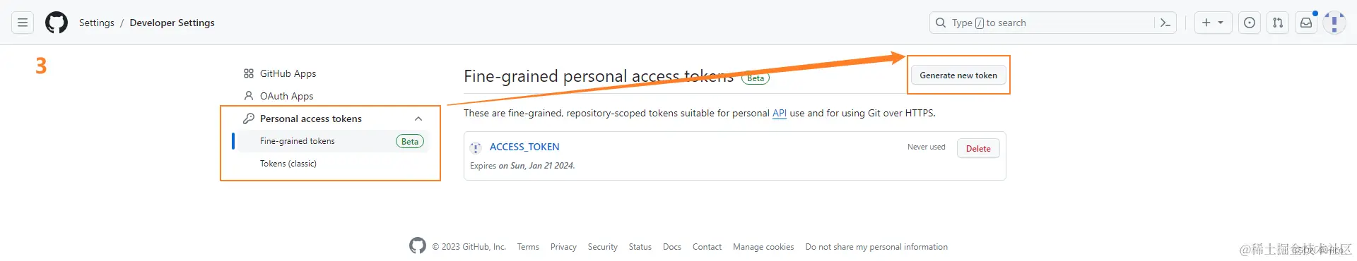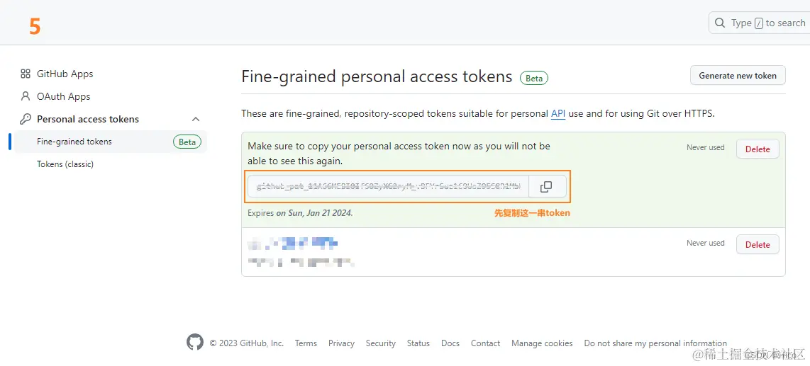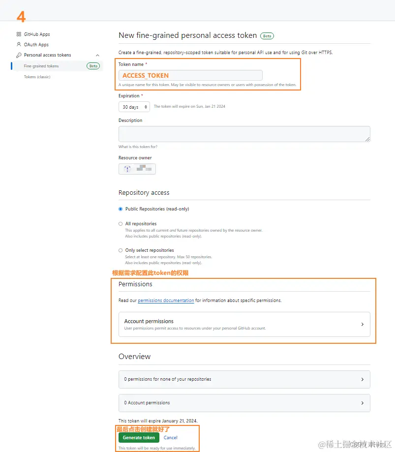 Settings > Developer settings > Personal access tokens > Fine-grained tokens > Generate new token > 最后得到生成的token,先复制保存-[重要];