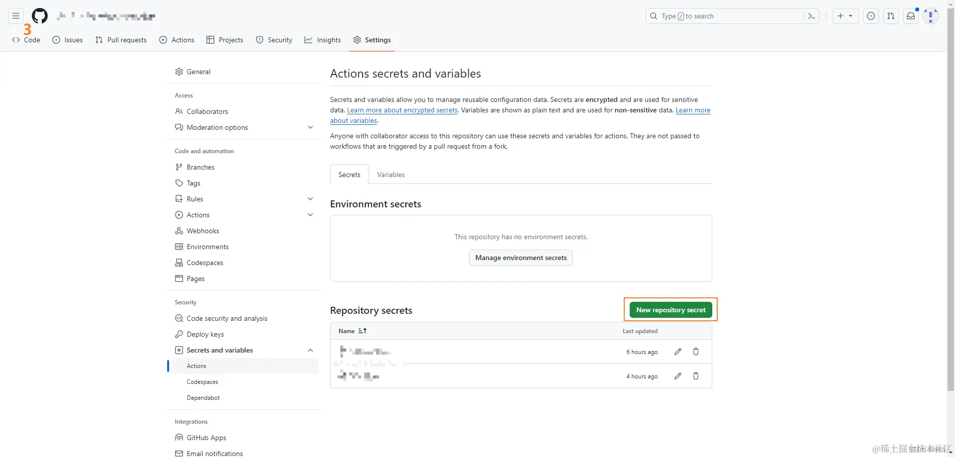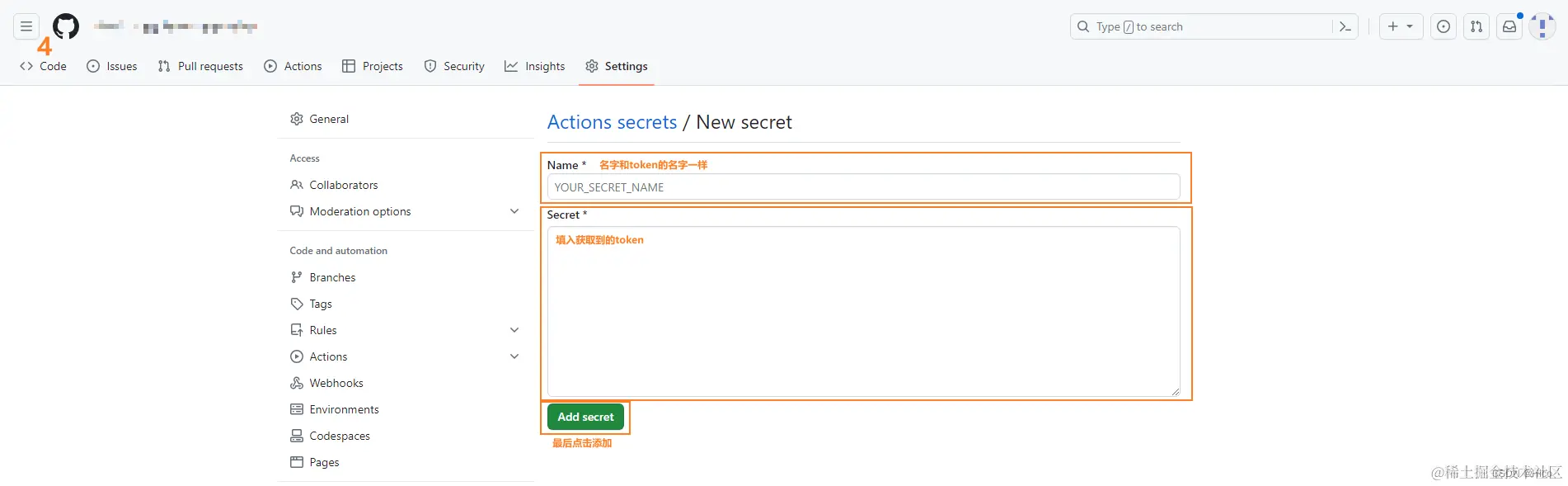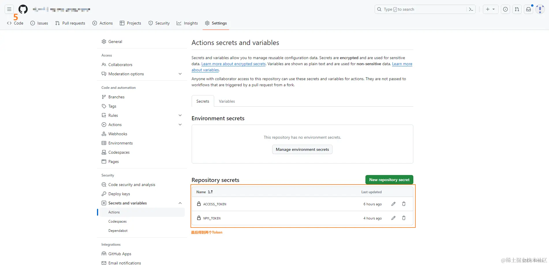 Settings > Secrets and variables > Actions > New repository secret > 分别添加在第二步中获取的GitHub以及NPM的Access Token。