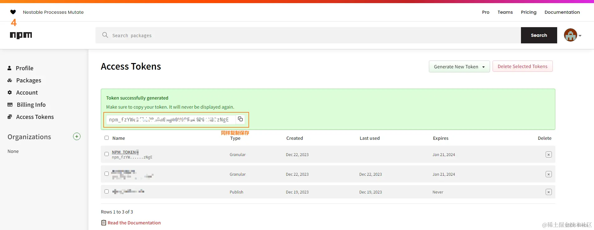 好了至此我们就拿到了GitHub和NPM两个地方的Token了,切记这两个Token要复制出来保存,因为一旦离开页面就看不到完整的Token了,当然如果不小心关闭了导致没有保存,可以按照同步骤再次创建,但最好还是保存起来。