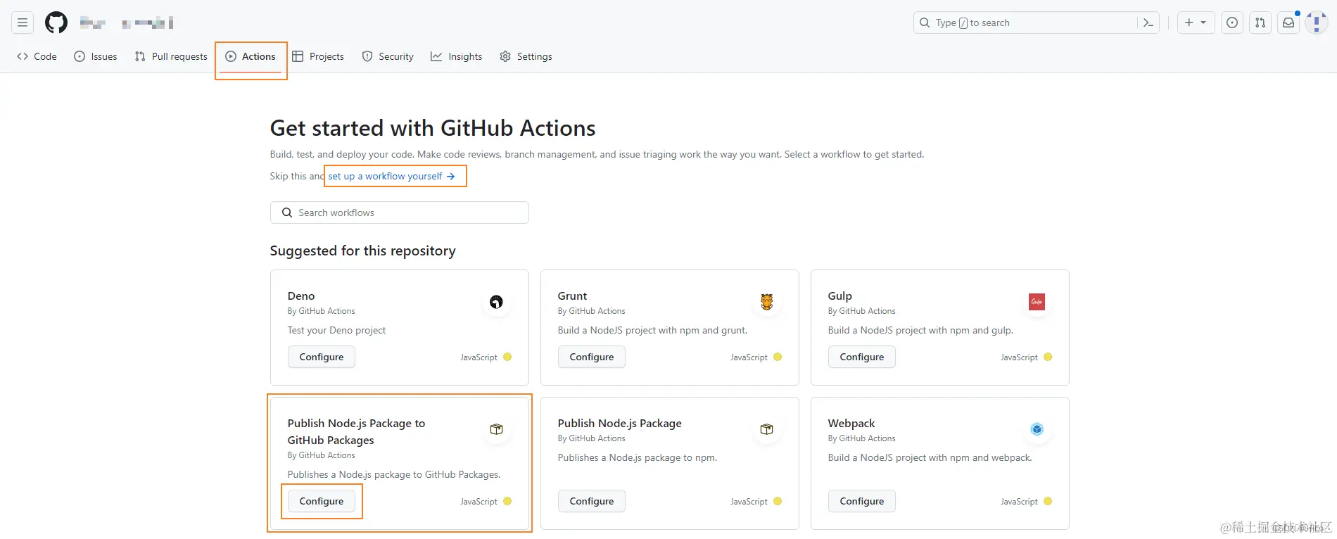 1、进入仓库选择Actions,我们可以选择 set up a workflow yourselfset up a workflow yourself 也可以快速配置选择此工作流程,点击Configure进行配置,