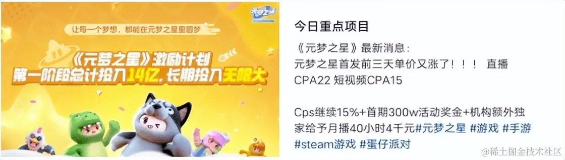 14亿元梦资金将被分为3亿内容激励、10亿地图制作和1亿电竞赛事三大部分。首先是内容激励,腾讯将与B站、抖音、斗鱼、虎牙、快手、QQ、微博、微信、小红书九大平台开展第一季“星梦合伙人”激励计划,用于丰富元梦之星生态内容。如抖音平台开出了直播引导下载成功每人22元、短视频引导下载成功每人15元的高额收益,引得无数主播转播元梦之星。