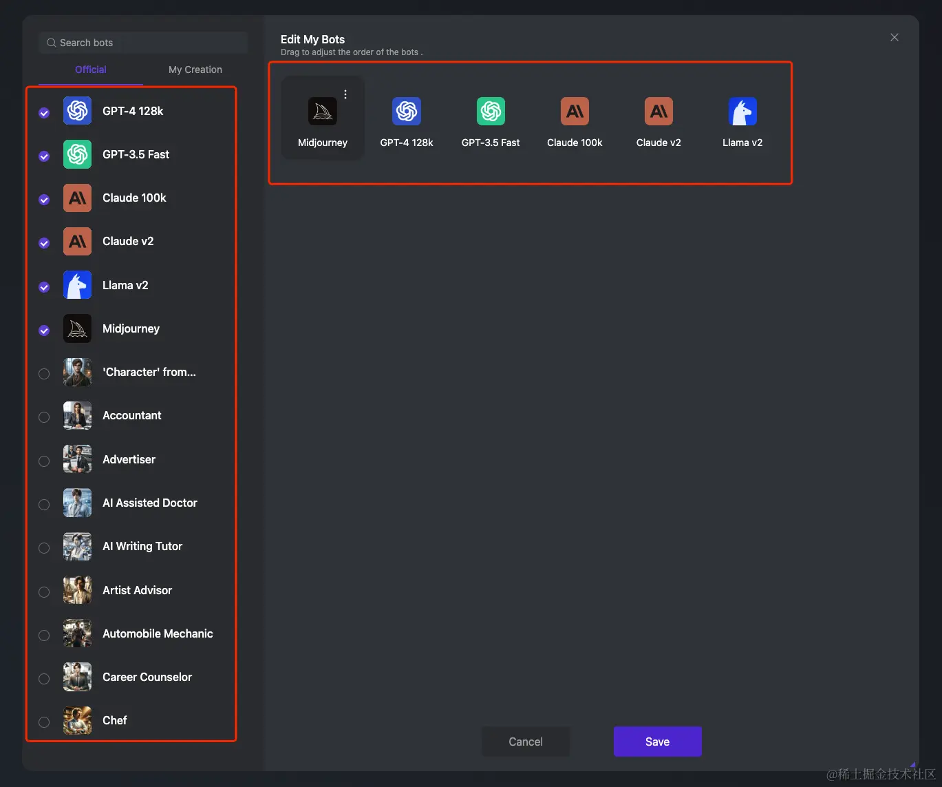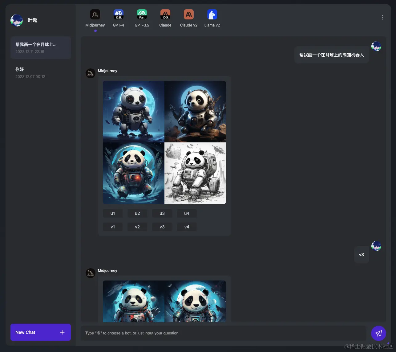 左边是内置的一些角色,右边菜单可以拖动设置优先级,默认一次一个,在输入框里可以@多个bot提问。