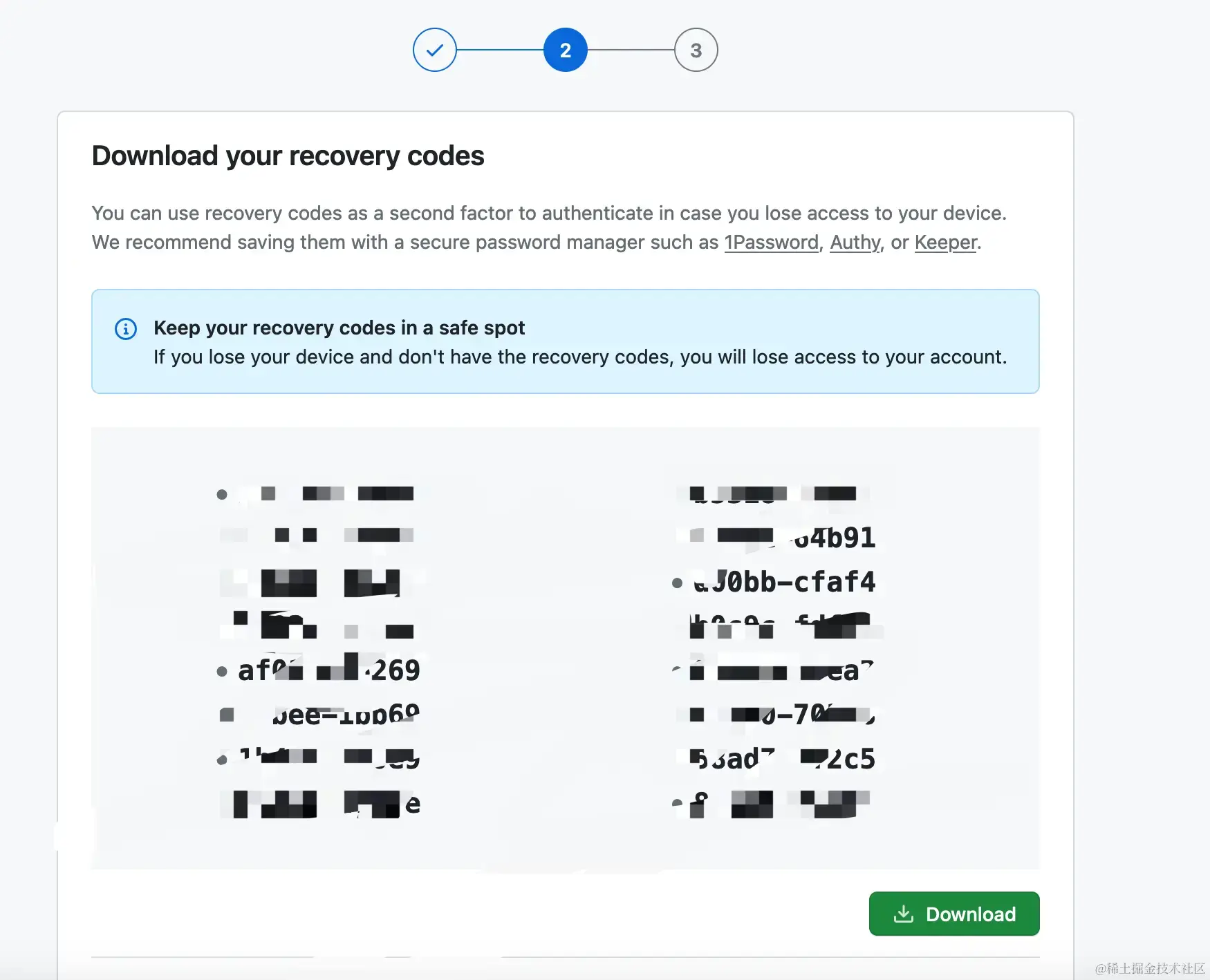 完成上述步骤之后,Github 会返回给我们一个 Recovery Codes,这个 Codes 需要我们点击 「Download」 保存在本地。
