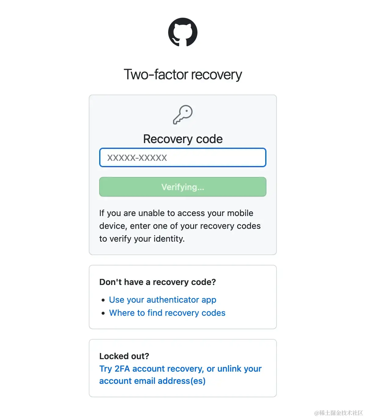 然后将我们保存在本地的 Recovery code 中的任意一个 code 输入进去即可完成登录。