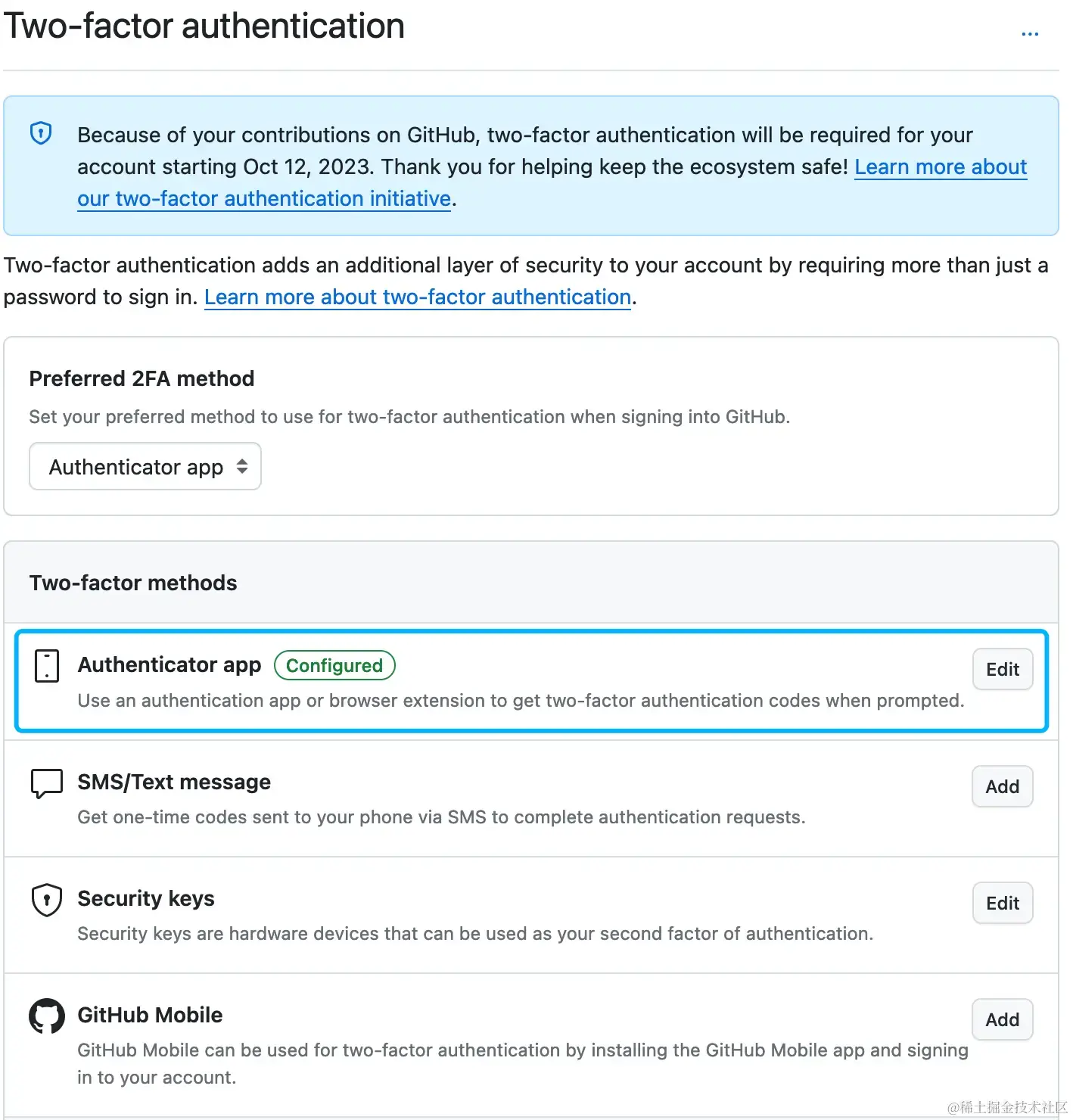 - 在右侧的主内容区找到 Two-factor authentication,没有开通 2FA 的用户会看到以下内容,我们点击「Enable two-factor authentication」进行开通(如果已经是强制要使用 2FA 了,那会直接看到下图)